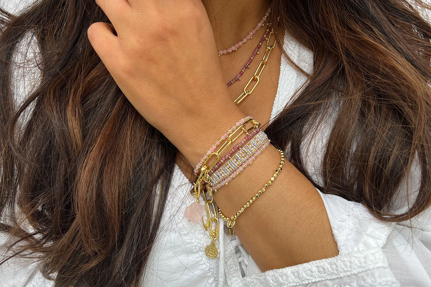 With its dreamy blush tones and glimmering gold aura beads, this gemstone bracelet is like golden hour captured in jewellery form. Each rose quartz stone is packed with radiant, feel-good energy, a symbol of unconditional love, self-kindness, and emotional healing.