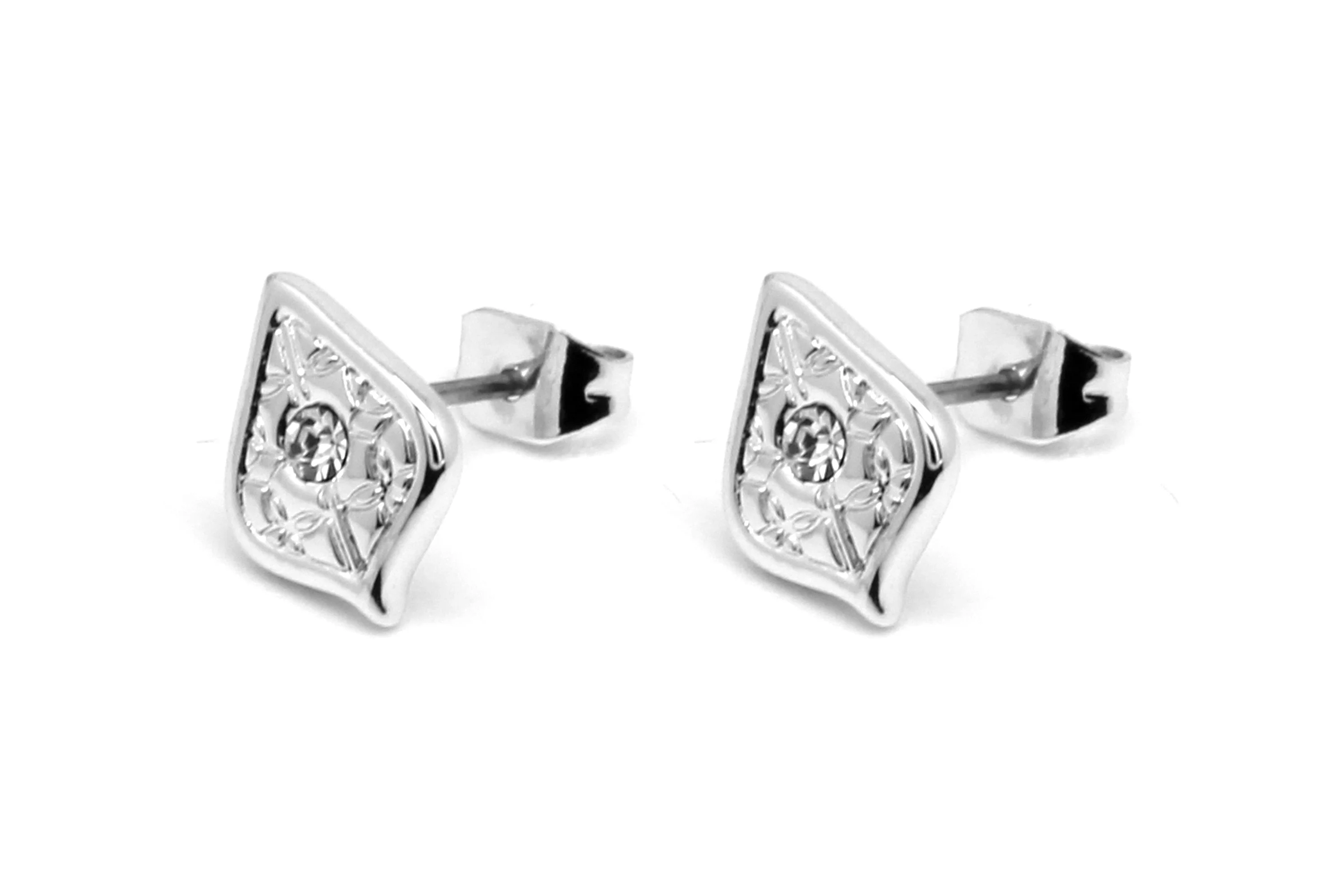 Filigree shaped 14k gold plate or .925 silver stud earrings- featuring our signature repeat pattern with a cubic zirconia crystal charm to add some sparkle to your look
