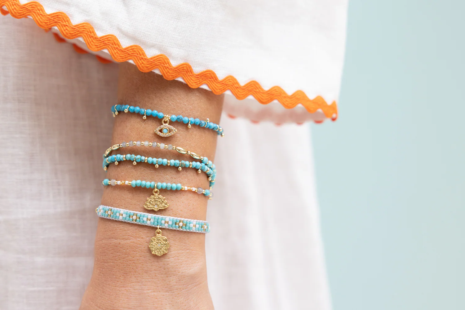 A friendship style bracelet bursting with turquoise, labradorite and gold gemstone beads on a chain cord with our gold signature logo silicone slider making it suitable for most wrists. It also features our signature flower charm. Made with 14k gold plate on brass.