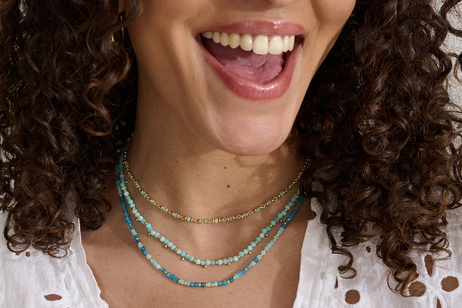Gold mid-length chain necklace with amazonite gemstones.