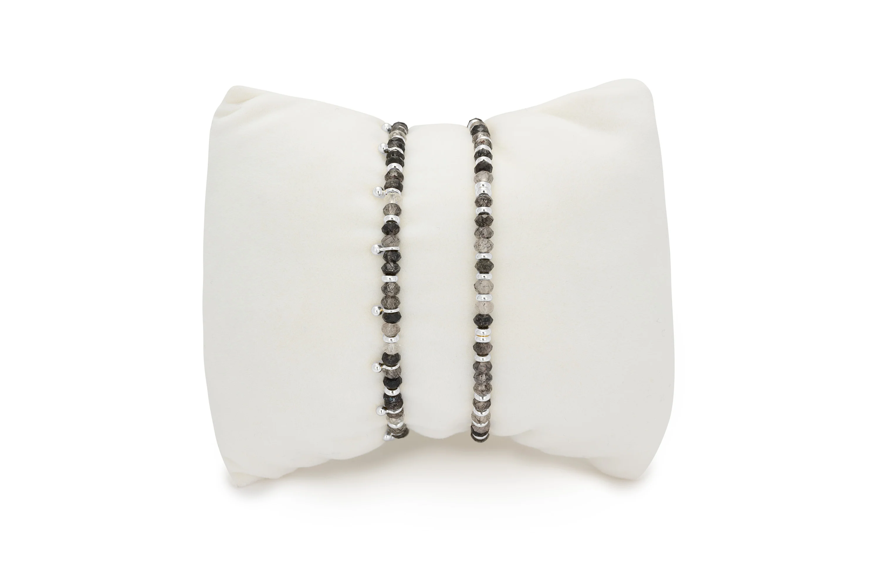 Discover serenity in style with our 2-layered gemstone bracelet stack. Embrace timeless beauty as delicate black ruitilite stones gracefully interlace with gleaming gold links, creating a versatile and elegant accessory that complements any ensemble. Elevate your look effortlessly with this chic piece, made with either 14k Gold or .925 sterling Silver Plate on Brass. Featuring Harmony and Mystical black ruitilite gold Bracelets, this stack is a perfect blend of sophistication and tranquility.
